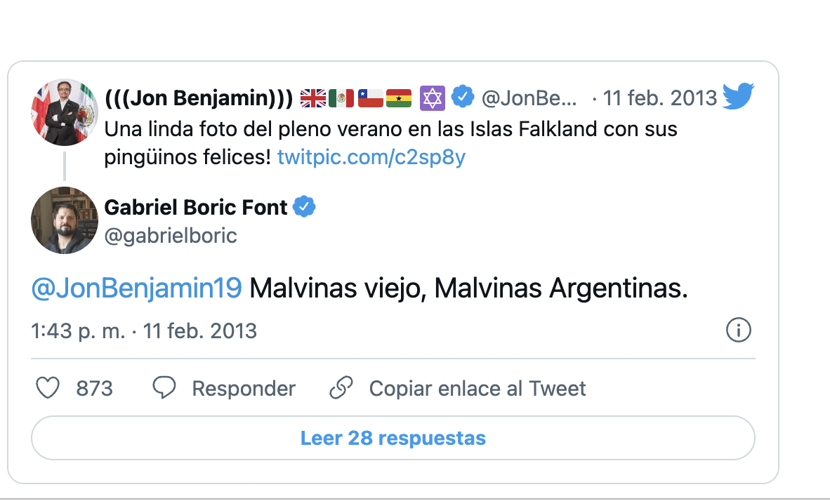 “Malvinas viejo, Malvinas Argentinas”, le respondió Boric en 2013 a Benjamin, quien había publicado una foto de las Islas con un texto que decía: “Una linda foto del pleno verano en las Islas Falkland ¡con sus pingüinos felices!”.