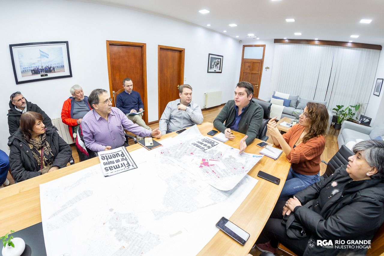 El intendente Martín Perez, junto al presidente del Concejo Deliberante, Raúl Von der Thusen, Silvina Mónaco, a cargo de la carteras de Obras Públicas, Gastón Díaz, secretario de Gobierno, recibieron a vecinos de distintos barrios quienes llevan adelante la mencionada campaña, para dialogar sobre las gestiones que tienen como fin la construcción de un nuevo puente para la ciudad de Río Grande.