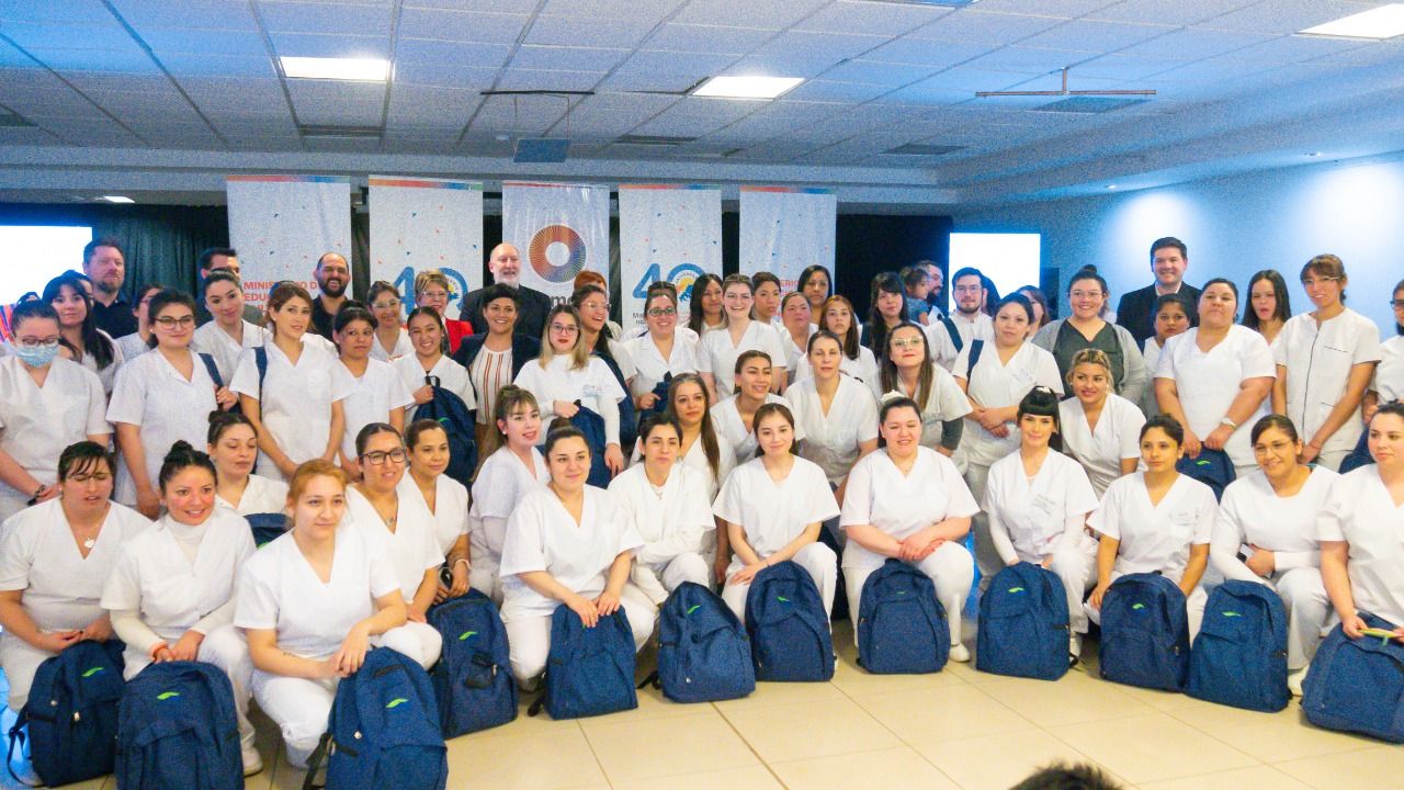 El Ministerio de Educación realizó la entrega de mochilas técnicas a estudiantes de la carrera de Enfermería del CENT N°35 de Río Grande.