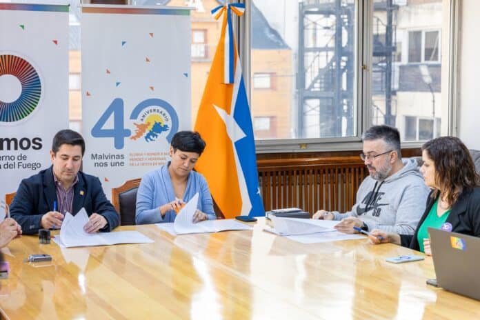 El ministro de Economía de la provincia, Federico Zapata, junto a la ministra de Educación, Cultura, Ciencia y Tecnología; Analía Cubino; al Secretario General de SUTEF, Horacio Catena; y los paritarios Javier Mastrocolo, Soledad Rottaris; rubricaron un nuevo acuerdo salarial para el sector docente.
