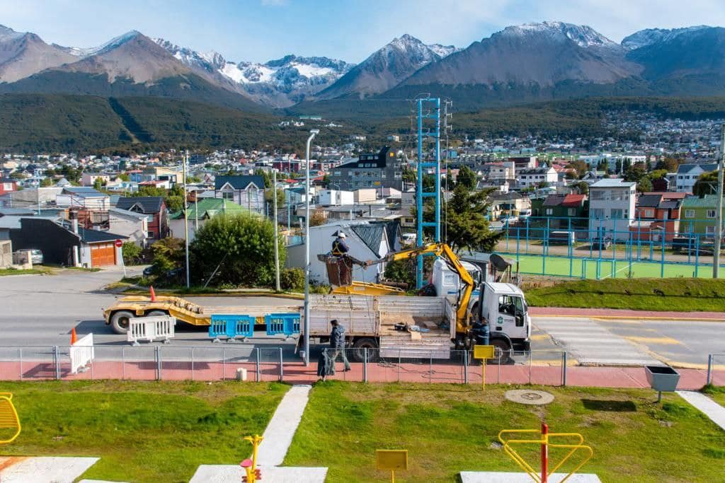 Personal del área de Servicios Públicos de la Municipalidad de Ushuaia lleva adelante trabajos de refuerzo del sistema de alumbrado público, consistentes en la colocación de equipos para mejorar la iluminación en espacios de uso común”.