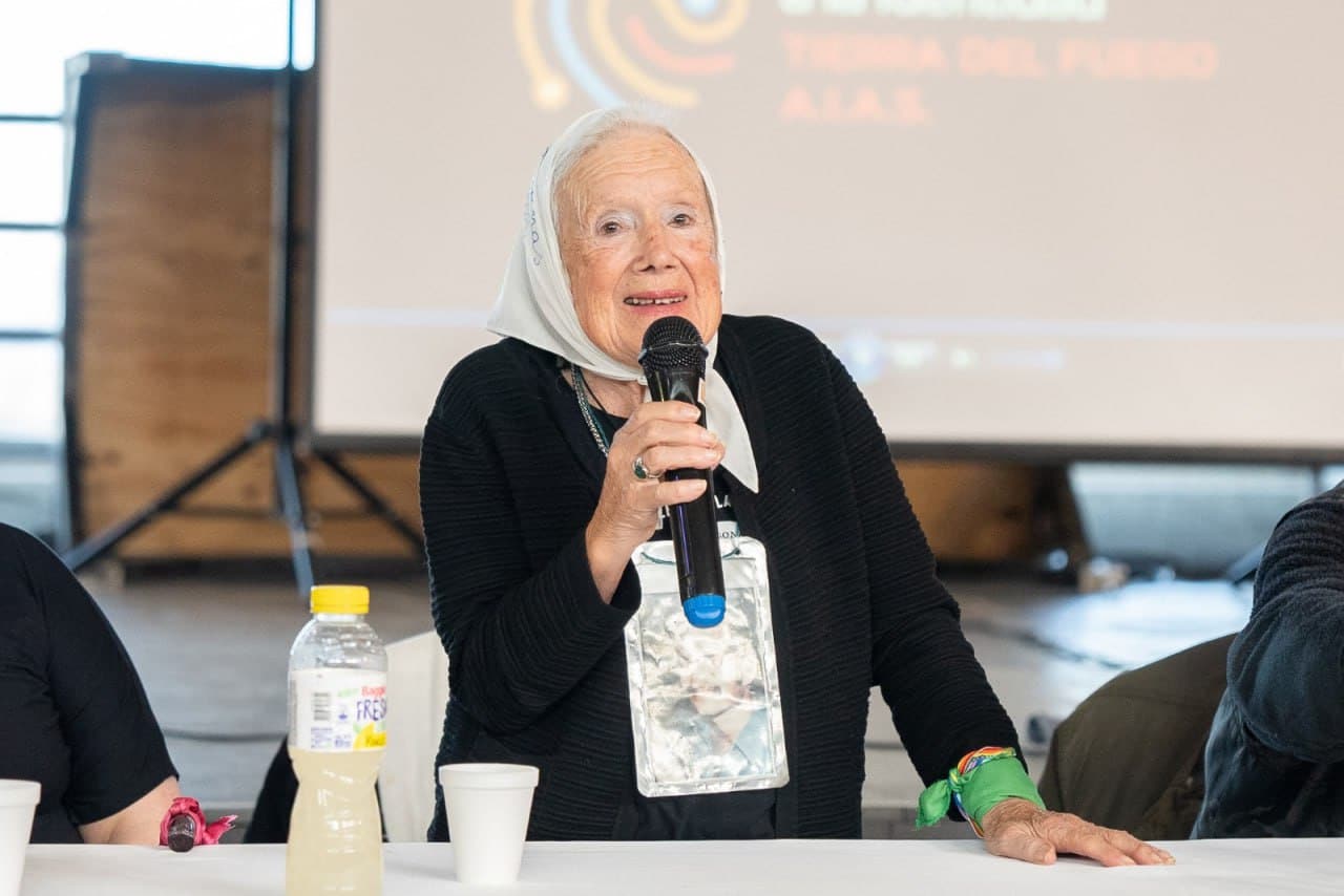 Cortiñas estuvo acompañada por Carlos Lordkipanidse, sobreviviente del Centro de Detención ESMA y Miguel Santucho, hijo de desaparecidos e integrante de la Comisión Directiva de Abuelas de Plaza de Mayo