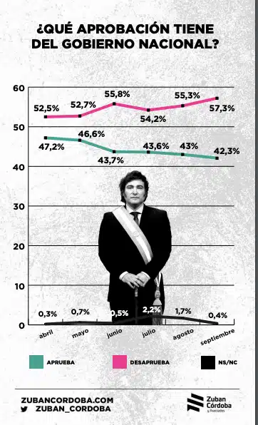 Que la palabra presidencial se devalue tiene como correlato la valorazación que hace la sociedad de la gestión del Gobierno. Allí los números revelan que la aprobación de La Libertad Avanza disminuyó 0,7 décimas y se ubicó en el 42,3 por ciento. En tanto, el rechazo escaló hasta el 57,3 por ciento. Eso sí, el apartado de No Sabe No Contesta es aún más estrecho entrando en el noveno mes del 2024.
