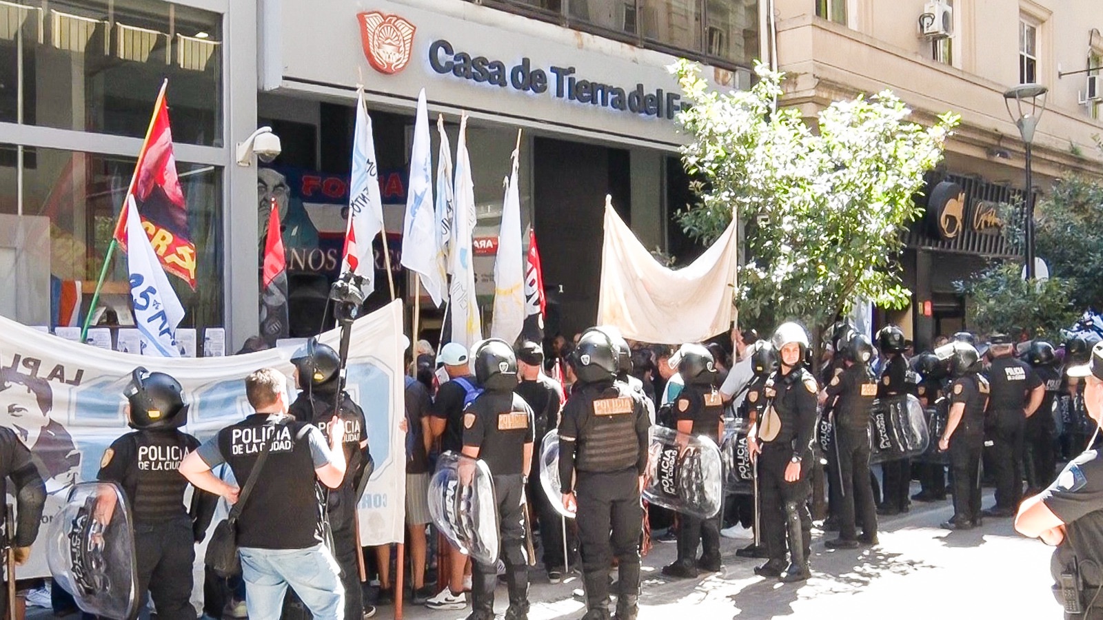 Agrupaciones políticas, sociales y referentes institucionales se movilizaron frente a la Casa de Tierra del Fuego, en la Ciudad Autónoma de Buenos Aires, para manifestar su repudio a la intervención federal del puerto de Ushuaia y reclamar su restitución a la órbita provincial.